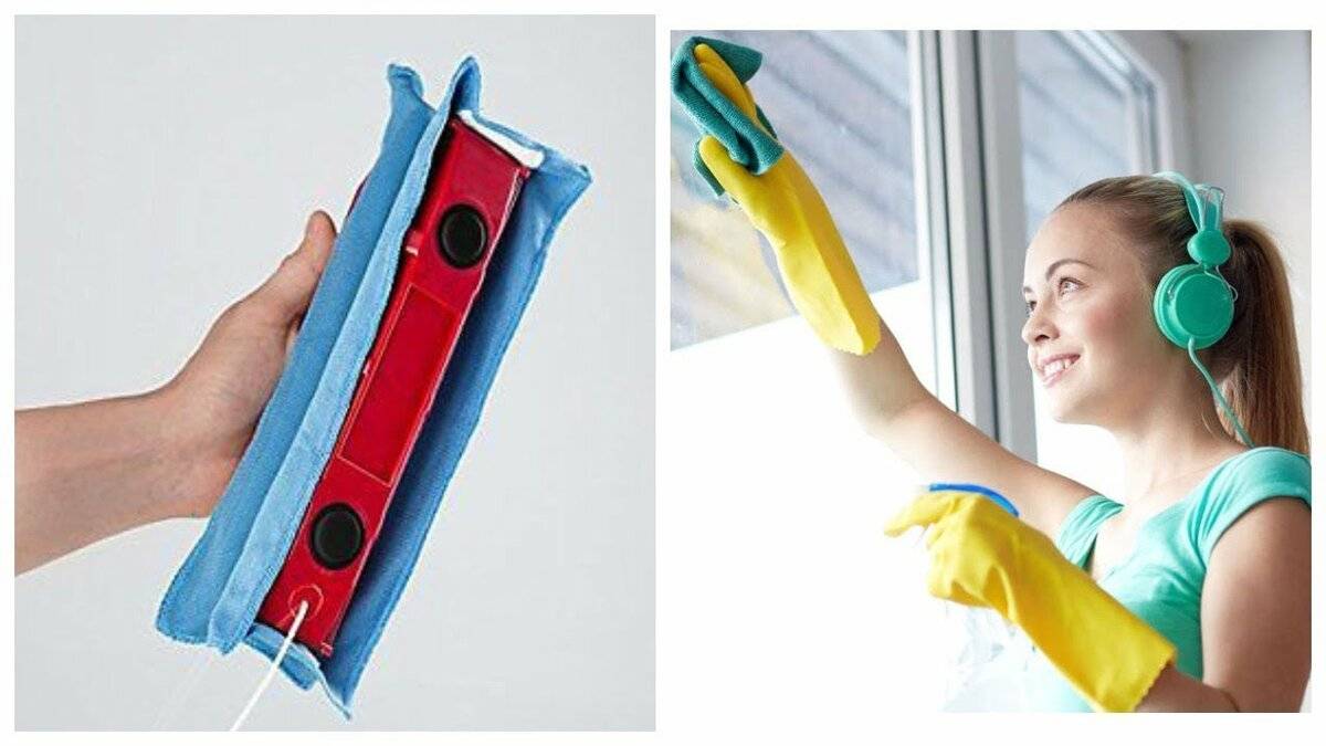 Другое технологичное средство — магнитная щётка. Она состоит из двух щёток с прикреплёнными к ним магнитам. Каждая помещается по обе стороны окна, а магниты притягиваются друг к другу. Таким образом, получается очень плотное соединение с поверхностью. Такая щётка хорошо подойдёт для труднодоступных мест.