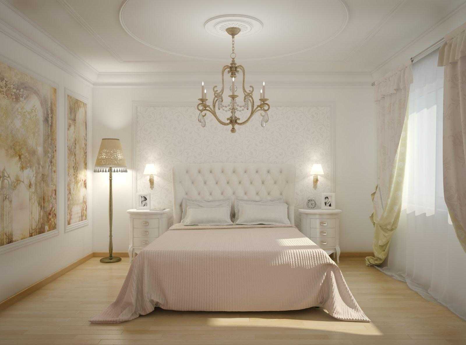 Классический. Главный акцент в спальне — кровать с декорированным изголовьем, которая должна создавать с ней единую композицию.