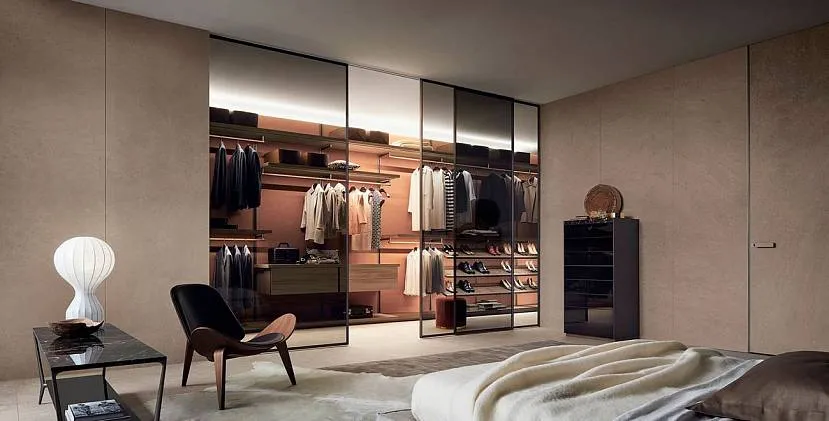 Перегородки гардеробной в спальне можно выполнить из металла и стекла