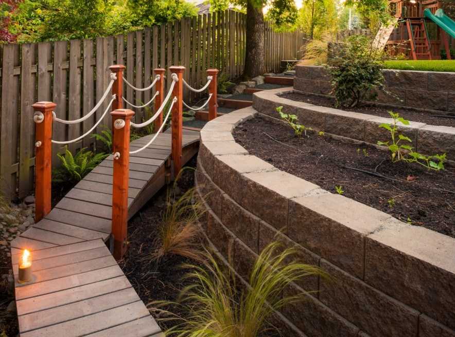 Если площадь перед домом позволяет, то оригинально будет построить аккуратный мостик ‒ переход между зонами палисадника. Этот элемент придает участку особую красоту.