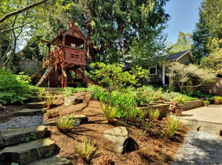 Что касается выбора растений, что предпочтение отдается кустарникам, цветам-многолетникам, деревьям, не требующим особого ухода.