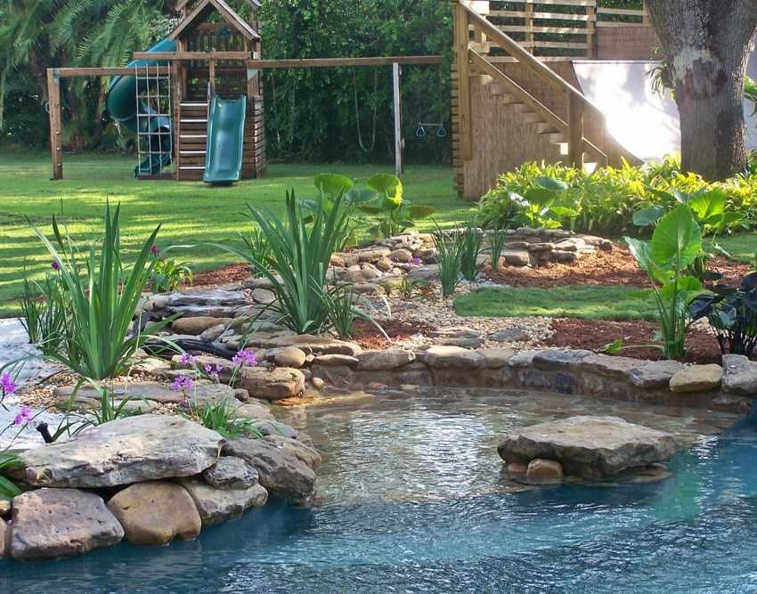 Рядом можно поставить лавочку, садовые качели. Берег можно обложить камнями, осадить вокруг растения, которые любят воду.