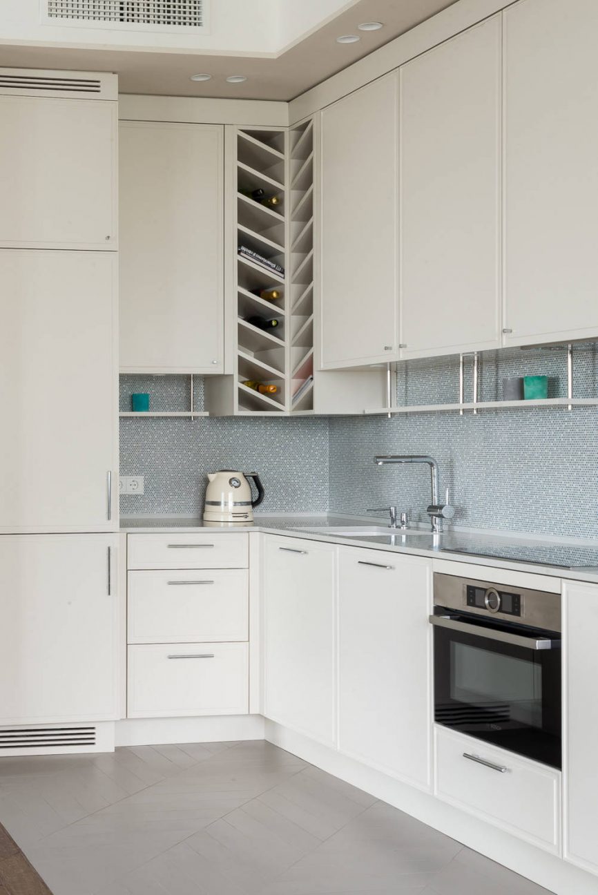 Фасады навесных шкафов без ручек выглядят как одно цельное полотно. Дизайн-студия m2project, фотограф Ольга Мелекесцева. Источник