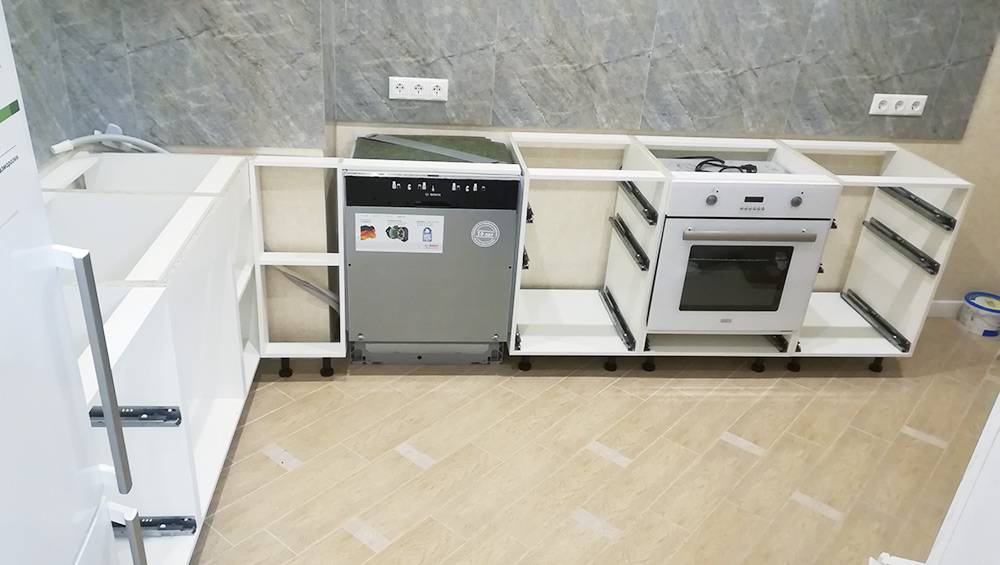Стандартные размеры модулей. Я прочитал в интернете, что ширину модулей делают на свой вкус с шагом в 5 см. Только под встраиваемую посудомоечную машину нужен шкаф с проемом 45 см или 60 см. А под духовку — с проемом 60 см. Сама техника на 4 мм уже, но для встраивания нужен запас по 2 мм слева и справа.