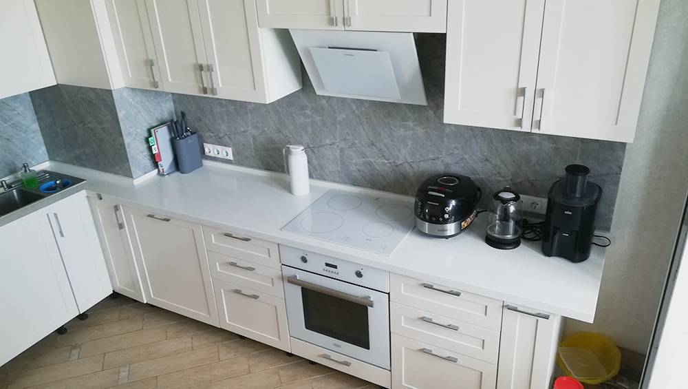 Этот проект кухни за 420 000 Р нам нарисовали в «Марии». Столешница была из кварцевого агломерата, а фасады — из МДФ с эмалью. Потом мы перенесли плиту подальше от холодильника