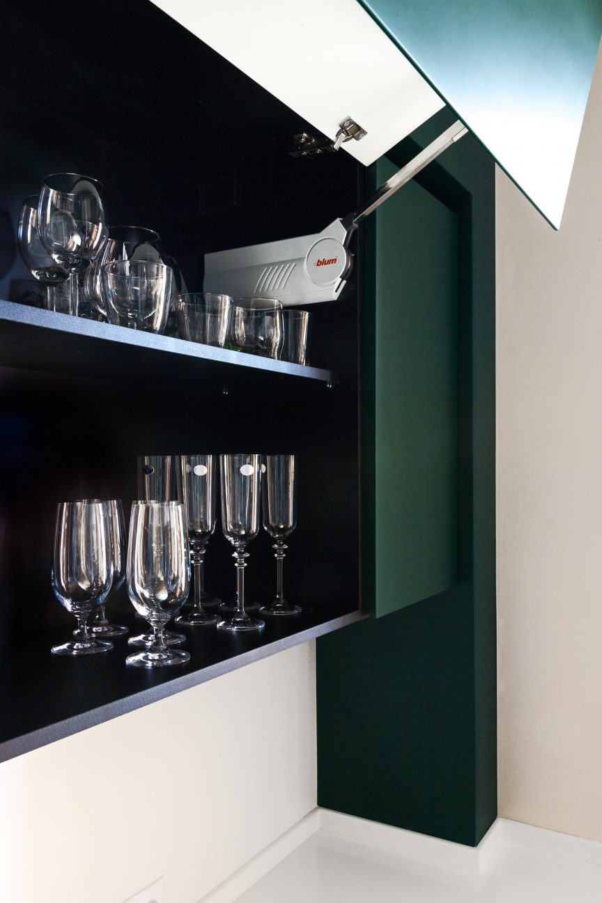 Наверху можно сделать открытые полки, на них расставить стекло или предметы декора. Дизайнер Анна Кларк. Источник