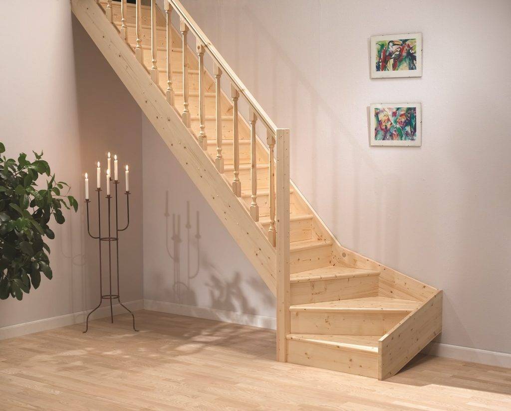 Не во всех помещениях имеется такое расстояние, поэтому лестницу делают поворотной, придавая ей Г или П-образную форму. Сам поворот делают либо из угловых ступенек, либо вставляют межэтажную площадку.