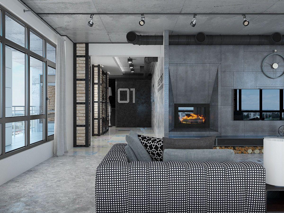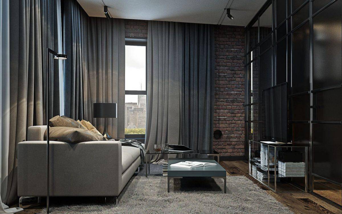 Цвет отлично подходит для индустриальной стилистики; стены при этом могут быть бетонными или покрытыми штукатуркой. Часть стены можно отделать белым кирпичом. Потолок также можно отделать под естественный цвет бетона, если комната не слишком тесная. С такими «грубыми» поверхностями отлично гармонируют однотонные серые шторы и дымчатая обивка мебели.