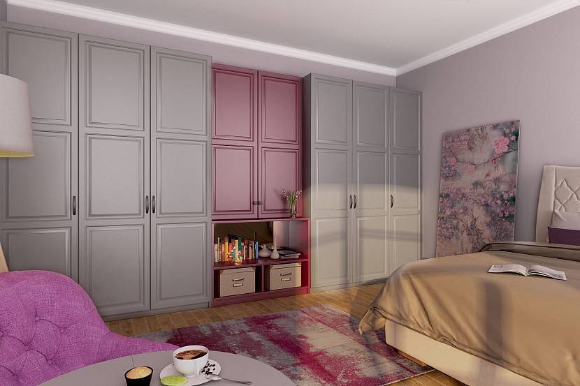 Розовый цвет на фоне серого сформирует в помещении романтическую и немного легкомысленную обстановку. Такое колористическое решение уместно в проектировании женского интерьера или в оформлении детской комнаты для девочки.