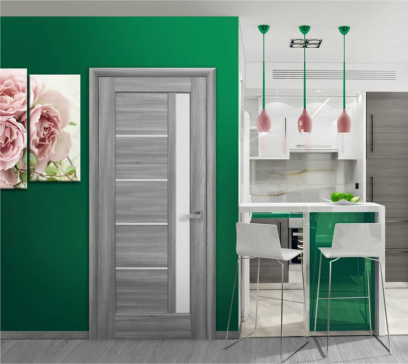 Светло-серая дверь в сочетании с зелеными стенамиИсточник vikna-dveri.net