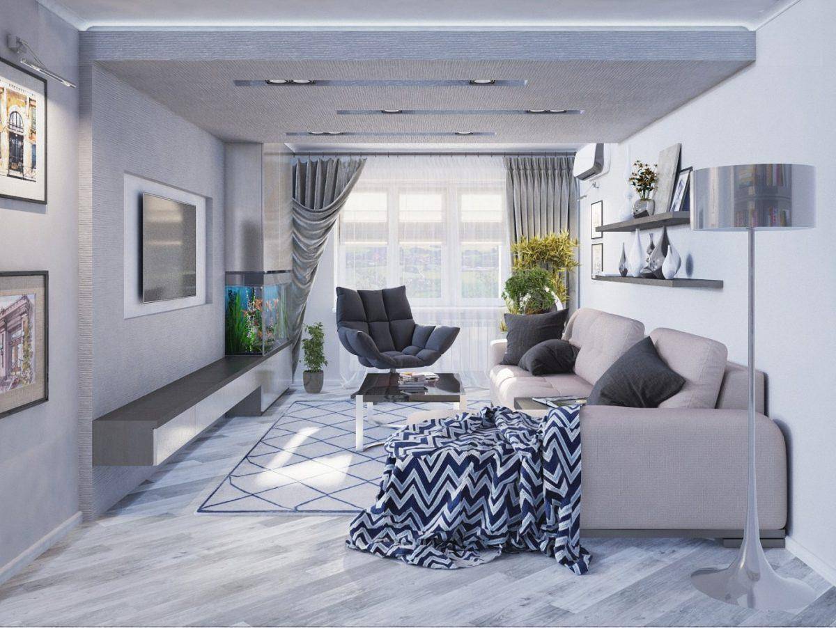 На фото дизайн гостиной, оформленный в серых и голубых цветах.