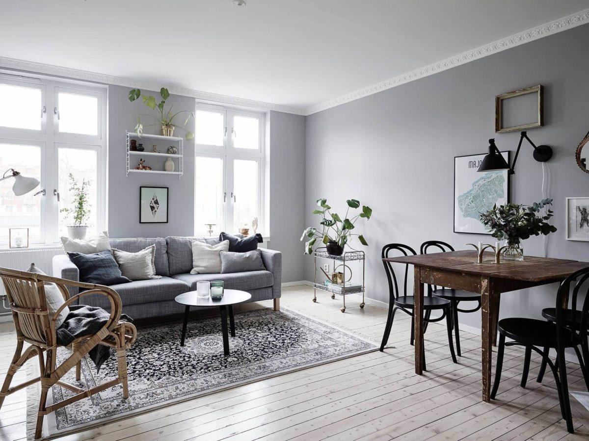 Стиль сочетает натуральные материалы, простоту, лаконичность и функциональность. В нём легко обустроить гостиную в серо-белых тонах. Стены отделываются белой или светло-серой краской, пол – серым керамогранитом.