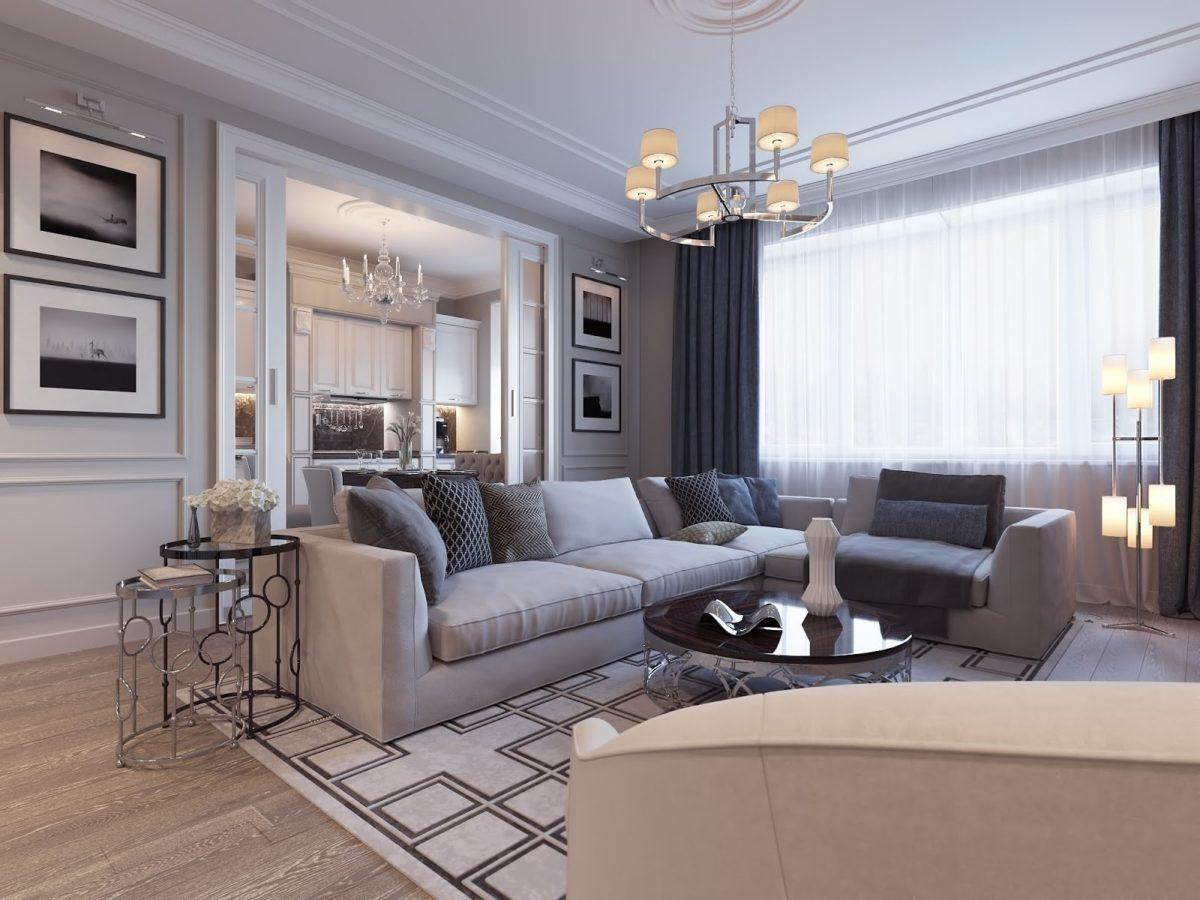 На фото дизайн просторной серо-белой гостиной комнаты.