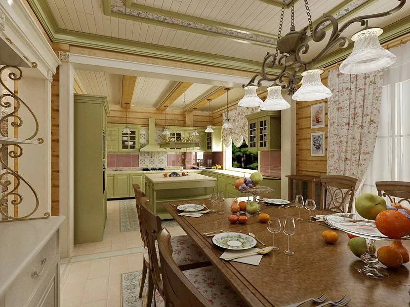 В деревянных домах гармонично смотрится кухня в стиле кантри, прованс, эко. Для цветового оформления используются пастельные тона, в большом количестве содержатся состаренные предметы интерьера, текстиль с природным рисунком, много натурального дерева.