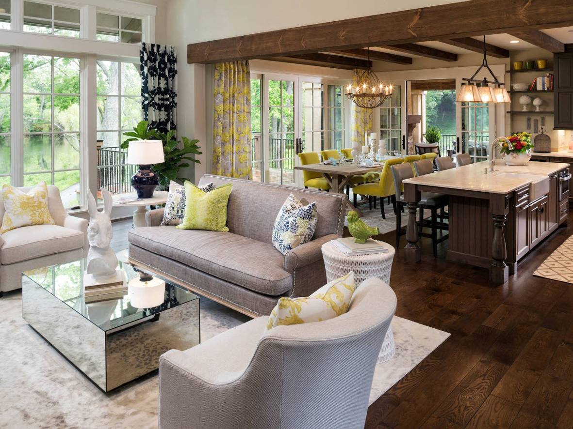 Внимание стоит уделить и деталям, а точнее подбору декоративных элементов, штор и остального текстиля. Дизайн кухни-гостиной в загородном доме должен быть продуман до мелочей