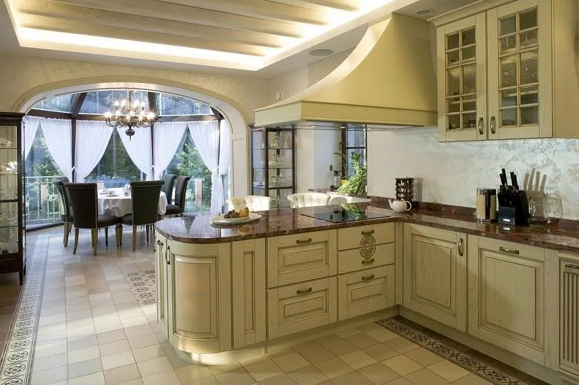 Для каменных и кирпичных особняков в классическом стиле уместна классическая и неоклассическая кухня. Каждая деталь интерьера подчеркивает статус и хороший вкус хозяев. Кухня всегда выполнена с островом в виде обеденного стола – это особенность, которую предполагает классический и неоклассический интерьер кухни в частном доме. Классическая кухня симметрична, пропорциональна, выполнена в светлых, пастельных тонах и декорирована золотом.