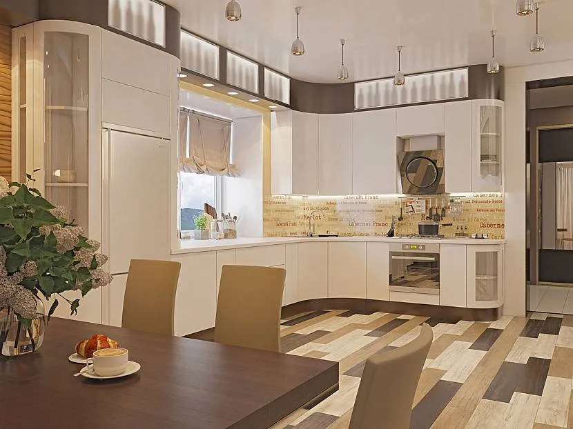 Кухня и столовая в современном стиле с обтекаемыми шкафчиками в угловой планировкеИсточник studiodi.ru