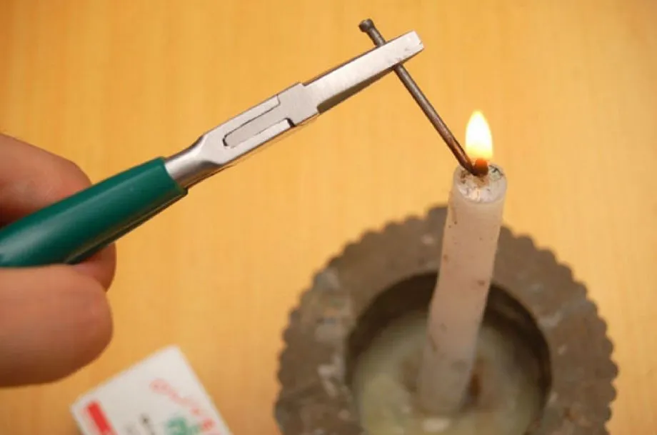 Стальной элемент зажимаю в пассатижах, после чего подношу к пламени. Температуру металла не советую проверять пальцем, иначе можно обжечься. Поверхность гвоздя должна разогреться до белого состояния. В среднем, процедура занимает от 3 до 7 минут. Время зависит от мощности источника огня. Горячий штырь быстро прикладываю острым концом к полиэтилену, пробивая нужную дыру, и вынимаю с остатками материала.