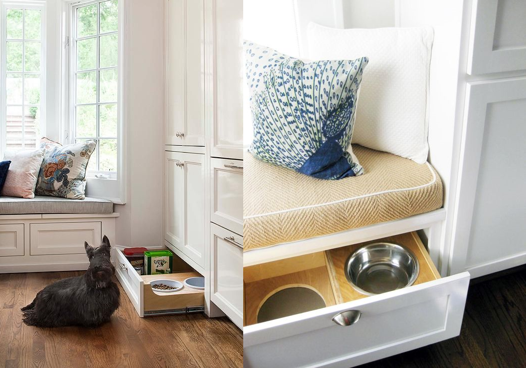 Что делать? Проявить креативность. Собачью лежанку можно разместить на нижнем ярусе шкафа, в прикроватной тумбе или под журнальным столиком. Миски — зафиксировать на кухонном острове или встроить в выдвижной ящик. А кошачий лоток — спрятать в туалетном столике или плетёном коробе.