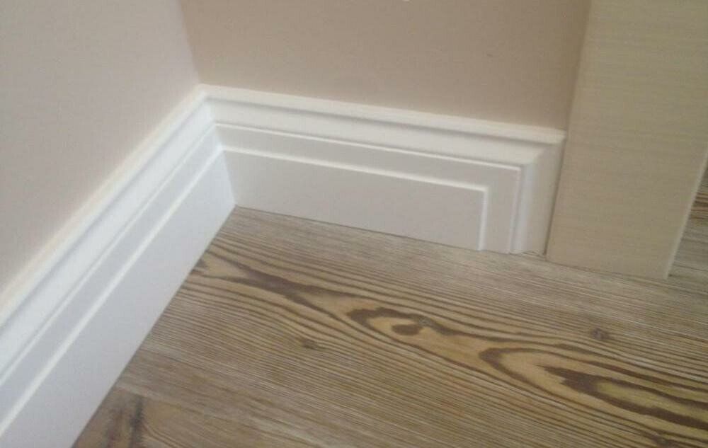 Вот пример правильного запила и ровной стыковки с плинтусом. Кстати, если не нравятся обычные наличники, можно сделать их интереснее с помощью полиуретана.