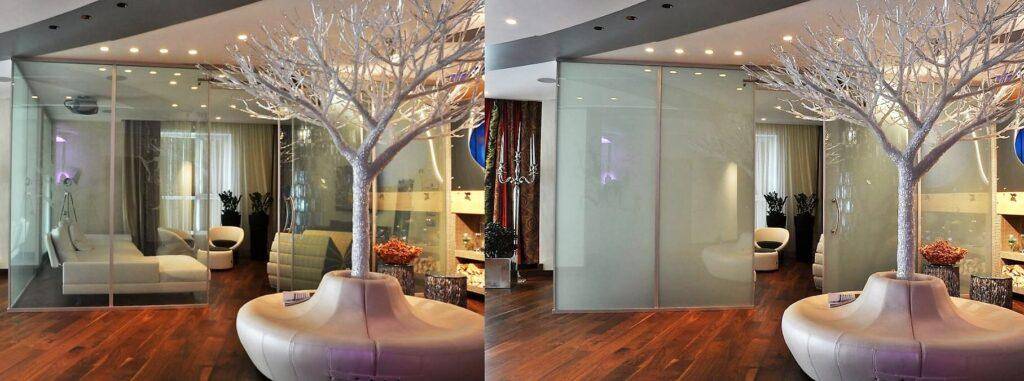 В обоих случаях способность материала пропускать свет не меняется. Это делает смарт-стекло современной альтернативой жалюзи и шторам. Но у материала есть и недостаток — высокое энергопотребление.