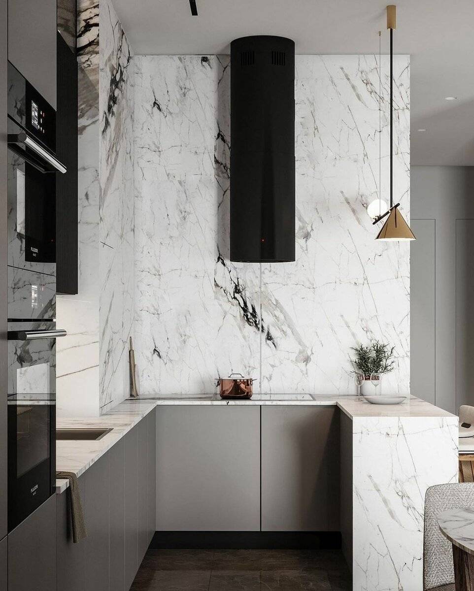 - Угловое расположение с островом. Больше подходит для помещений с площадью от 12 кв. м. Остров может выполнять разные функции, решений очень и очень много, поэтому стоит изучить современные идеи – фото и видео в сети достаточно. В этом случае нередко требуется масштабная перепланировка с переносом коммуникаций, что не всегда удобно и требует больших расходов.