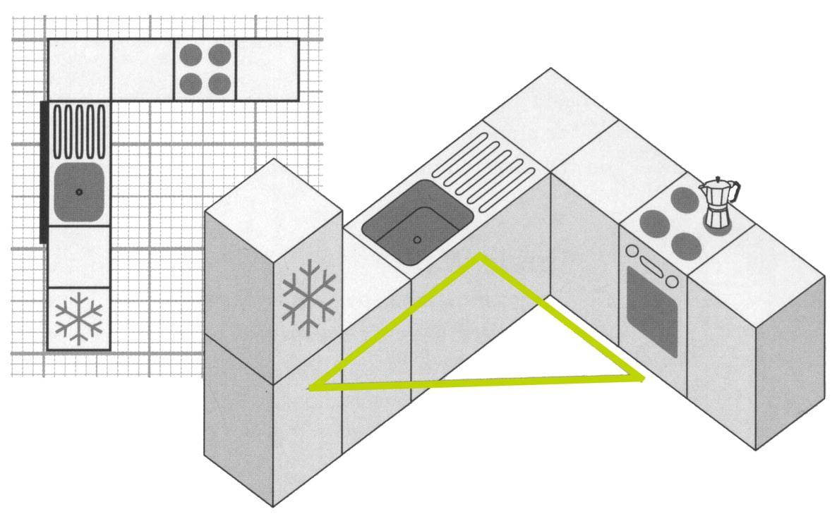 Угловая компоновка больше подходит для прямоугольных помещений. У нее есть ряд плюсов – доступность всех элементов рабочей зоны, компактное расположение отсеков для хранения, возможность установки большой раковины в углу.