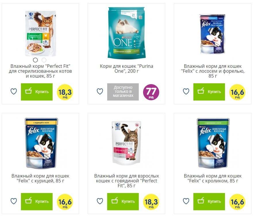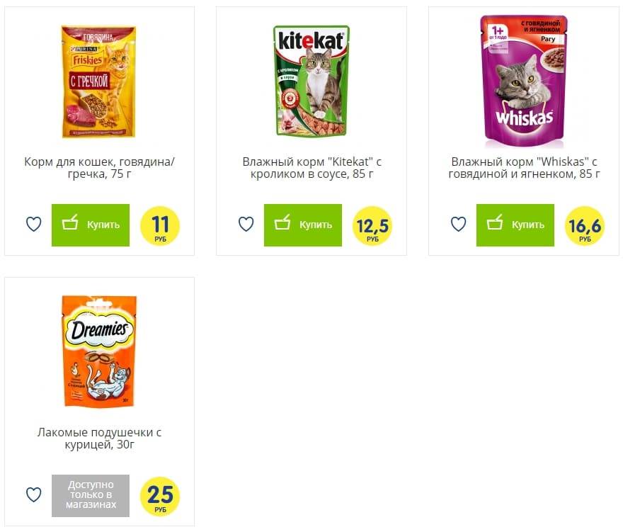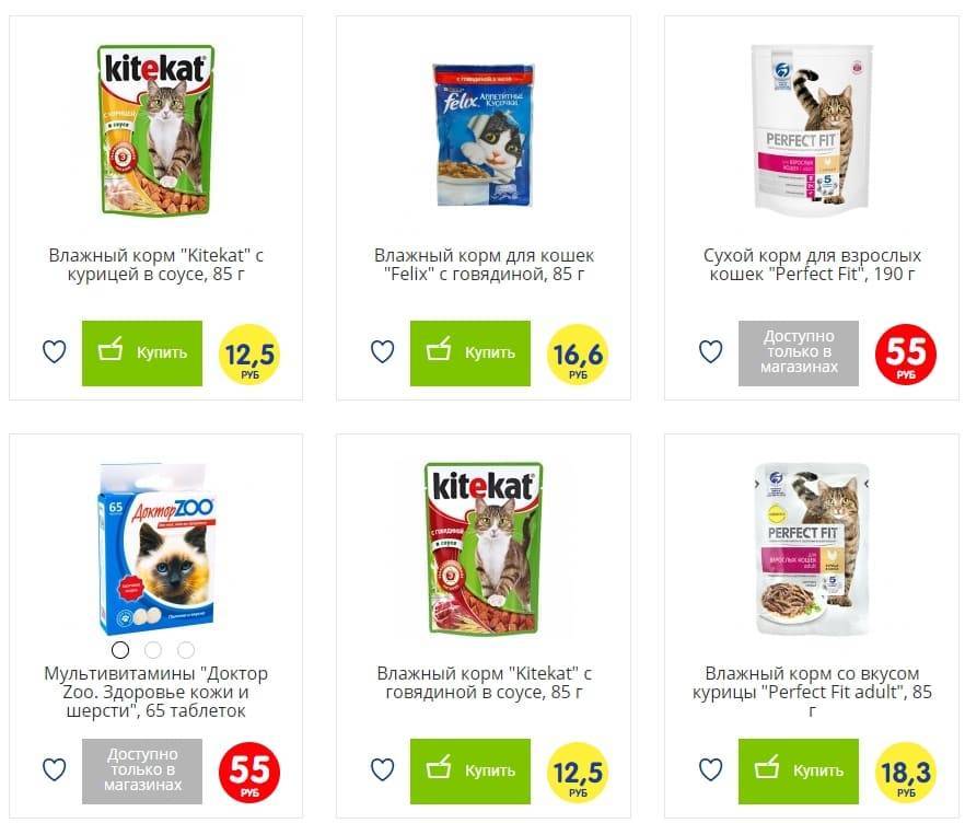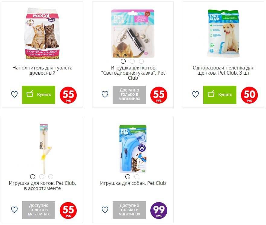 Пеленки, игрушки и наполнители для кошек, а также собак. В этой категории 5 товаров с ценником от 50 до 99 рублей.