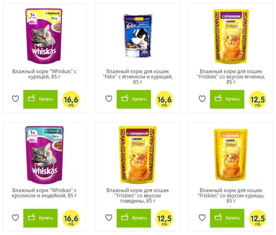 В Фикс Прайсе можно покупать корм для собак или кошек на повседневной основе. Есть как сухом, так и влажный корм. Популярные бренды: Whiskas, Kitekat, Dreamies, Felix и так далее. Цена от 12 до 77 рублей.