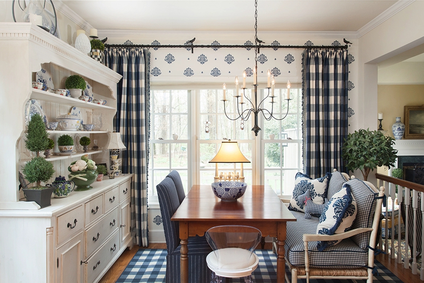Окно в кухне-столовой украшено текстильными занавесками