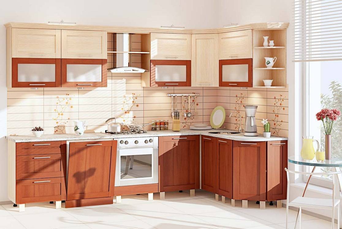 При выборе дизайна угловой кухни в первую очередь нужно подумать об оформлении угла – он может быть скошенным или же прямым. Прямоугольный вариант оптимален в условиях малогабаритного помещения либо при строгой ограниченности бюджета на ремонт кухни. Главный недостаток такого решения – довольно сложный доступ к содержимому углового шкафчика. Конечно, при желании можно установить вращающиеся полки, которые существенно облегчат задачу, но стоимость такого гарнитура возрастет в разы. Некоторые размещают в угол раковину или плиту. Но тогда фурнитуру использовать не получится вовсе.