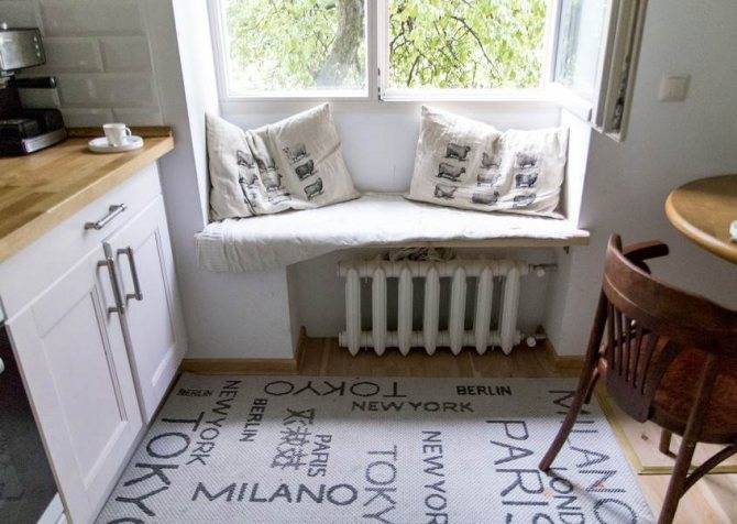 Создать площадку у кухонного окошка, где будет собираться вся семья и друзья, лучше всего обладателям квартир с широким проемом. Здесь можно поставить небольшую мягкую софу и, удобно разместившись, наблюдать пейзаж за окном с чашкой чая.