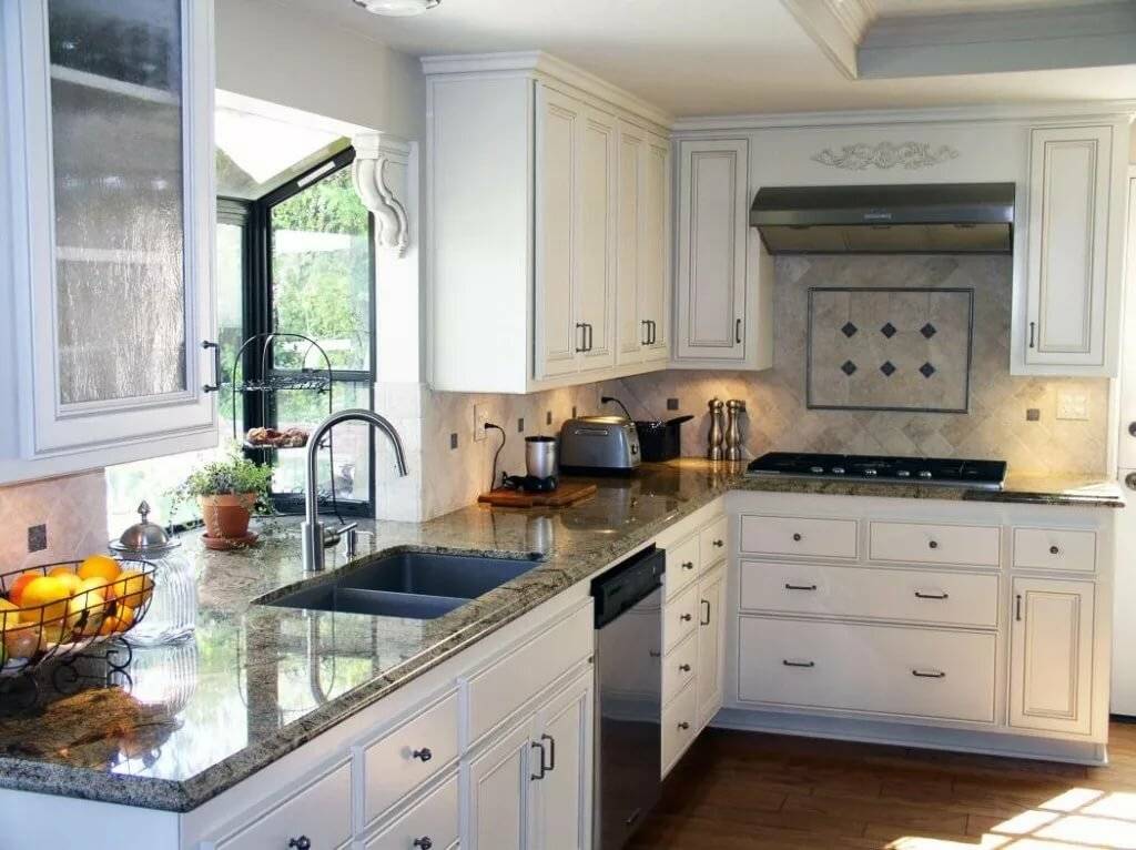 Основной точкой является рабочий треугольник, который включает холодильник, варочную поверхность и мойку. Идеальным сочетанием можно назвать одинаковое расстояние между этими тремя элементами, что как раз и получается при Г-образном расположении кухонного гарнитура.
