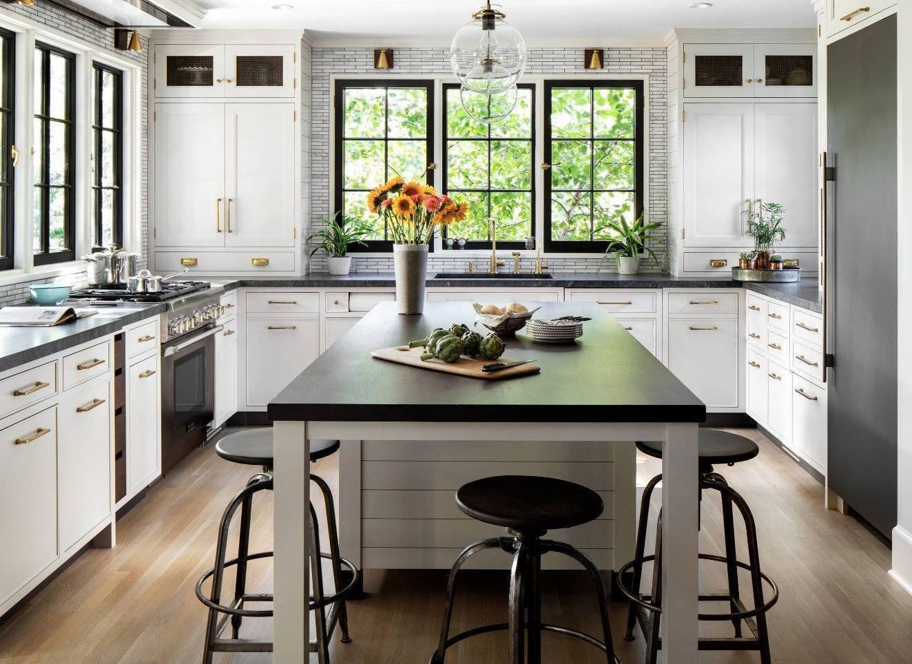 В вашей кухне два и более окна? Счастливые обладатели просторных помещений могут позволить себе любой дизайн, а обилие дневного света делает возможным использование любых оттенков, в том числе, черного и коричневого цвета.