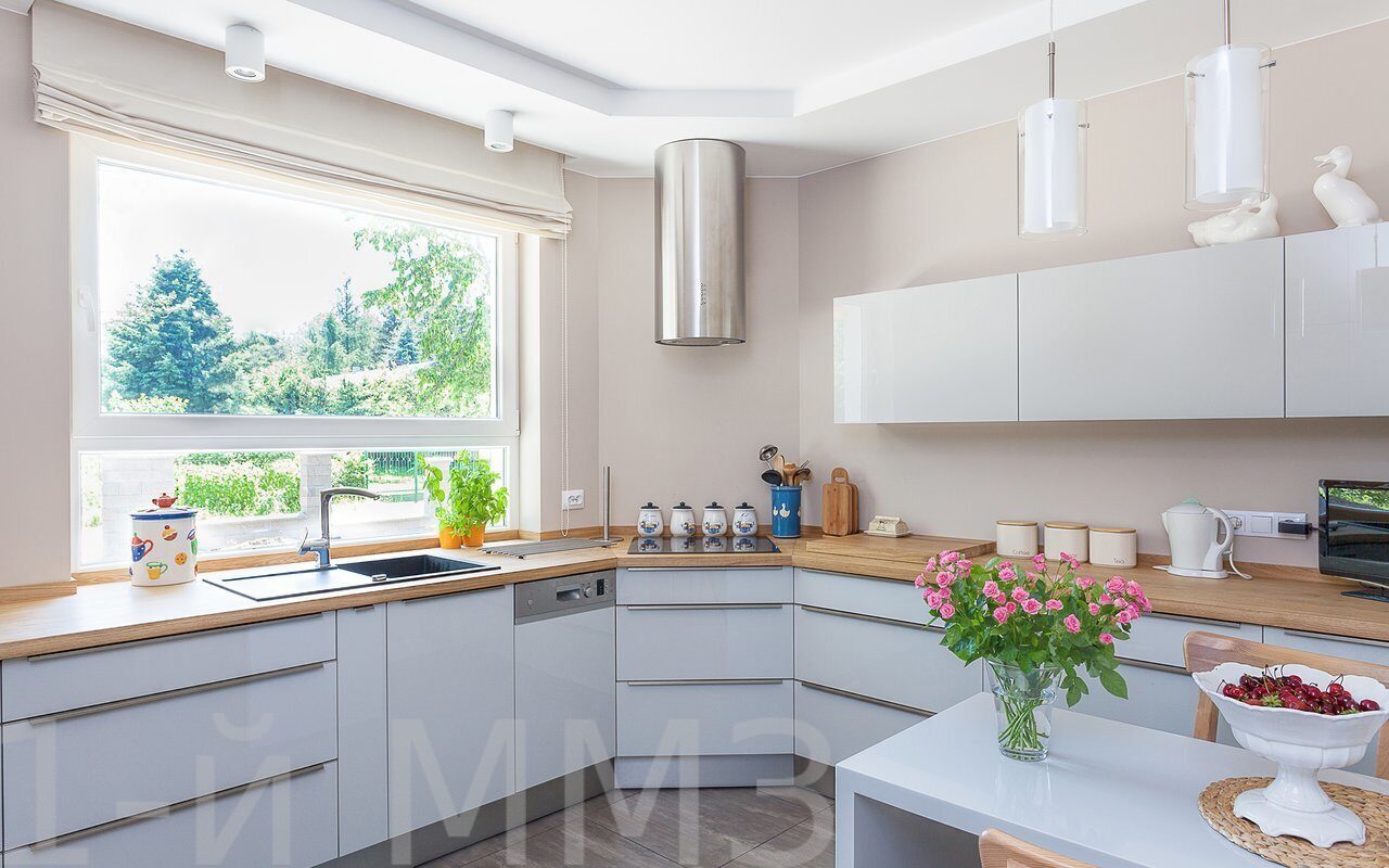 Дизайн П-образной кухни с окномИдея для П-образной кухни с большим окном
