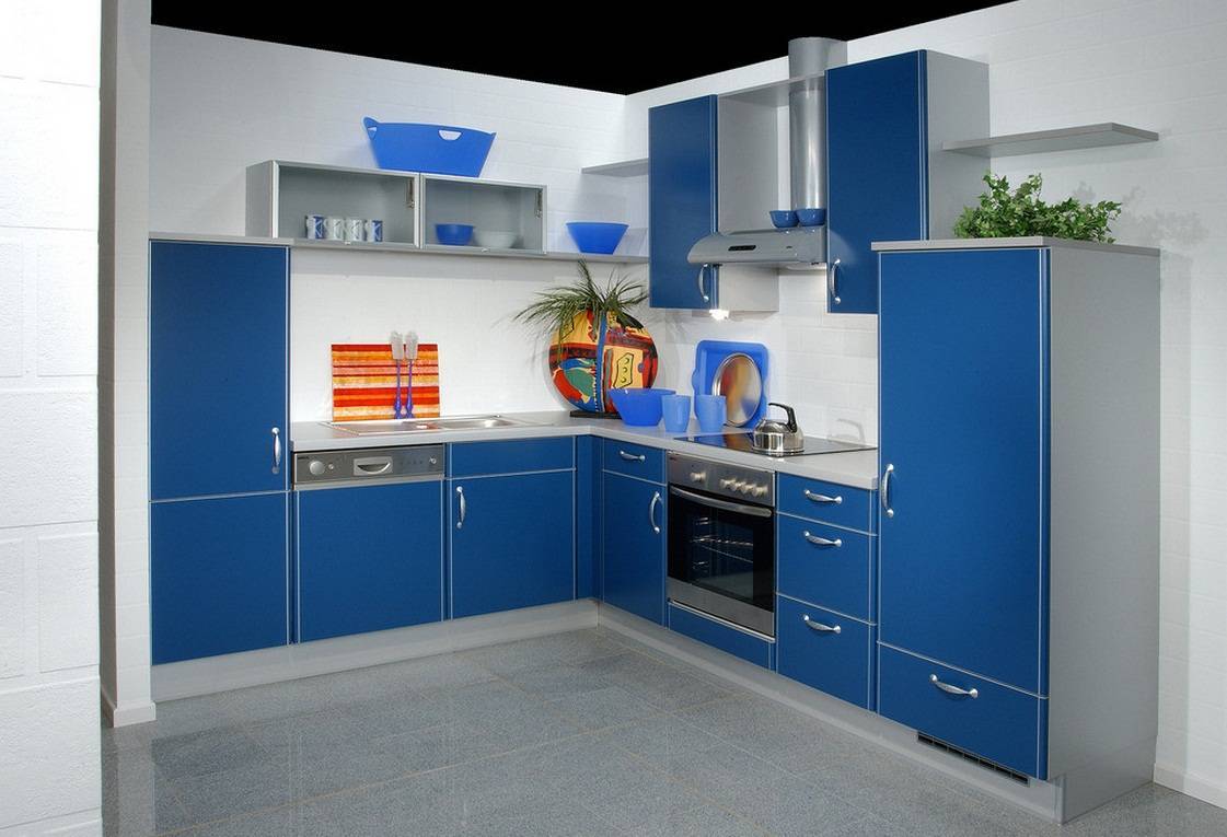 Наличие хорошего освещения делает возможным декорирование в темных тонах даже маленькой комнаты. Кухня с окном посередине может быть выдержана в синем и фиолетовом цвете, можно окрасить стены в синий тон и установить светлую мебель.