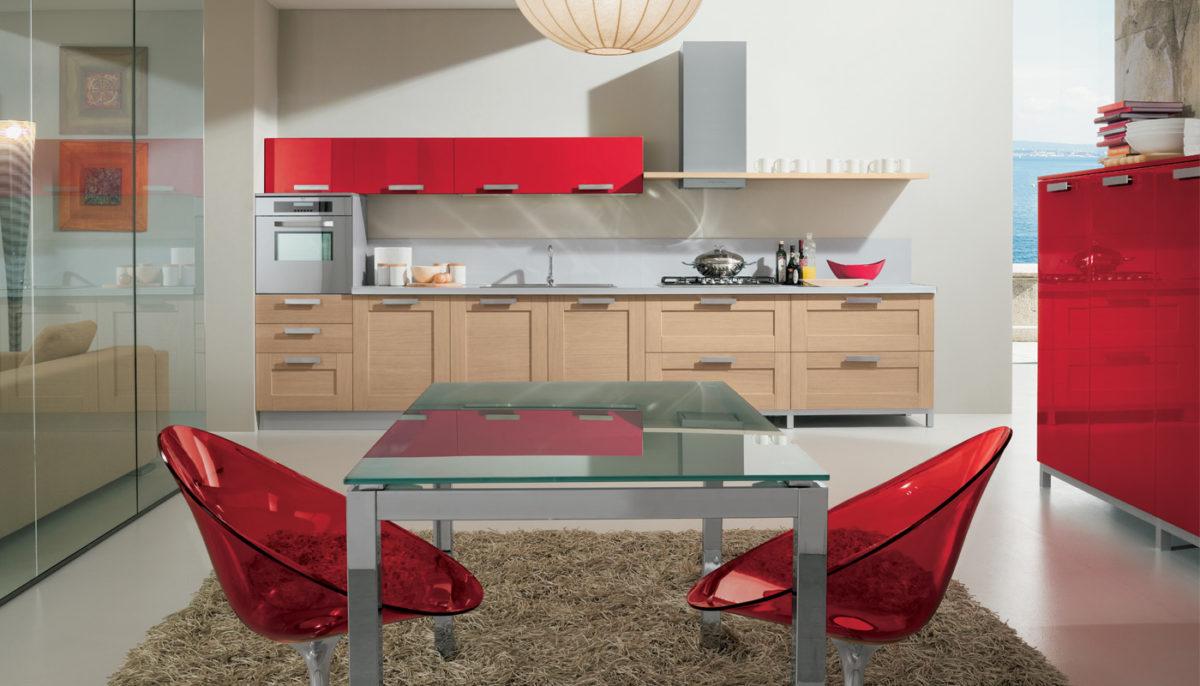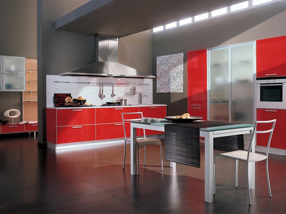 Стол и стулья — очень важная часть любого кухонного интерьера. Красные деревянные стол и стулья будут отлично смотреться в помещении, выполненном в стилях кантри, деревенский, шебби-шик, средиземноморский. Для кухни, интерьер которой выполнен в стиле минимализм или хай-тек, можно подобрать стол и стулья, выполненные из красного пластика и металла. Что касается столешницы, то она может быть стеклянной. Приветствуется наличие блестящих хромированных элементов.
