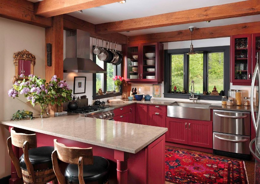 Бордовая кухня прекрасно выглядит как в современном, так и в традиционном исполнении