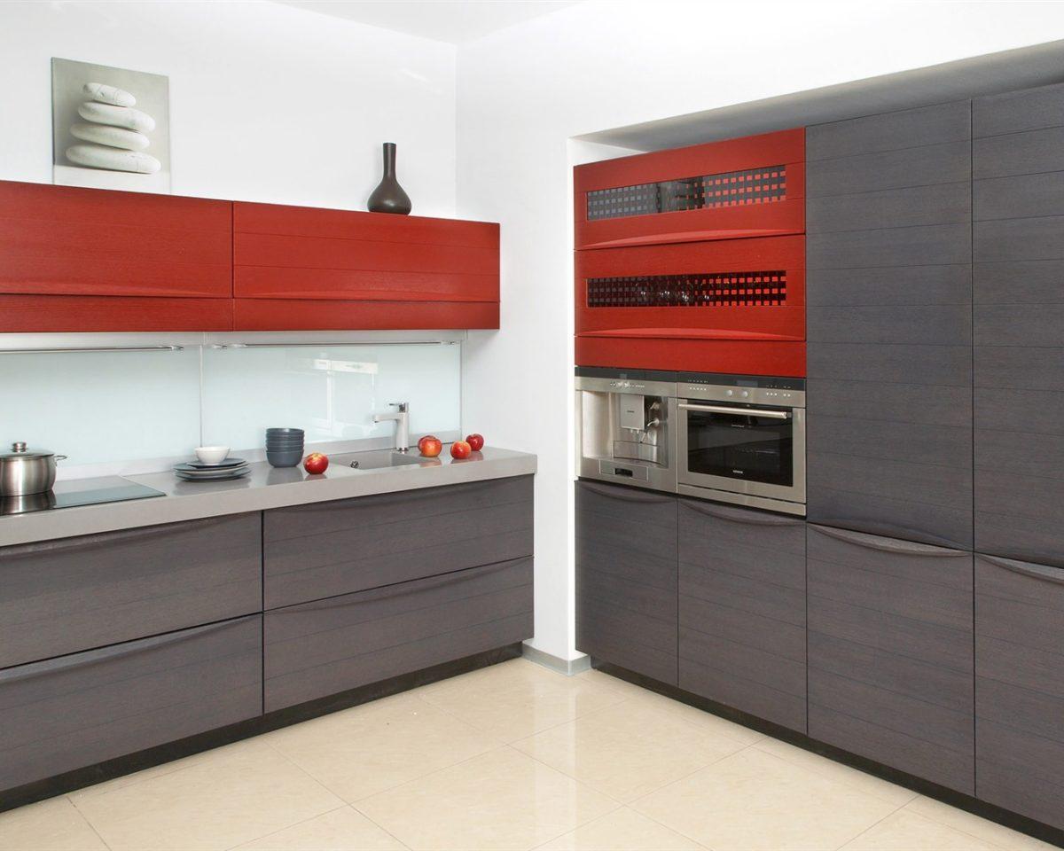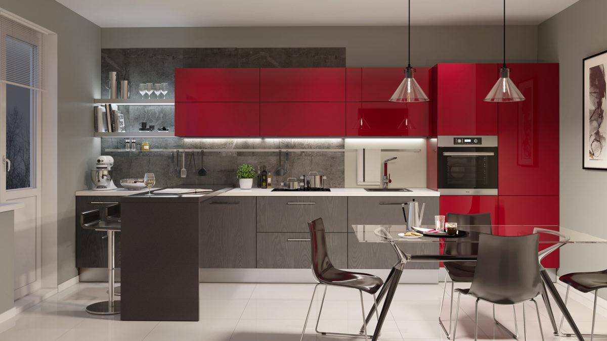 Для красно-серой кухни обычно используются глубокие оттенки серого с фиолетовым подтоном. Их сочетание с сочным алым подходит для кухонь в современных стилях – от простых минималистичных до авангардных вариантов.