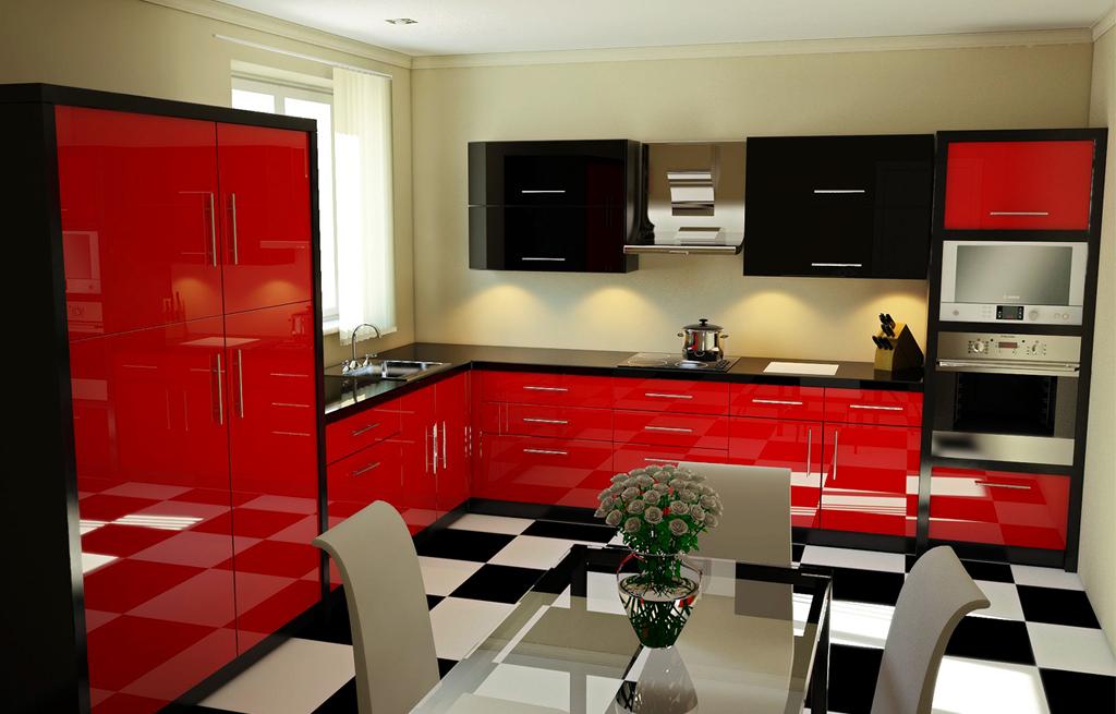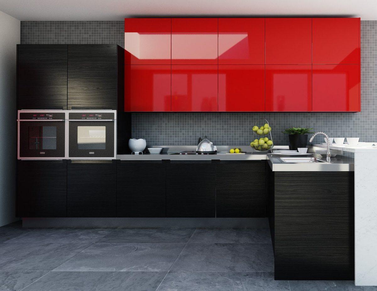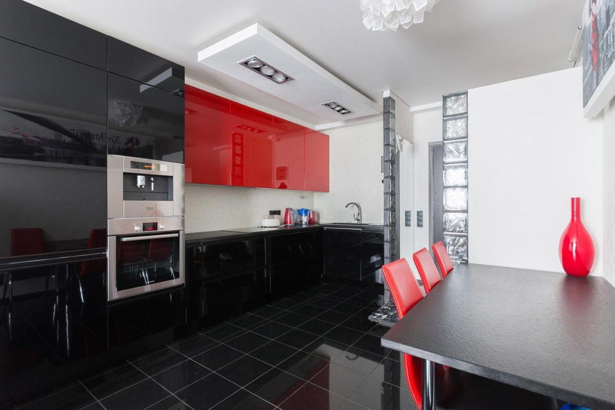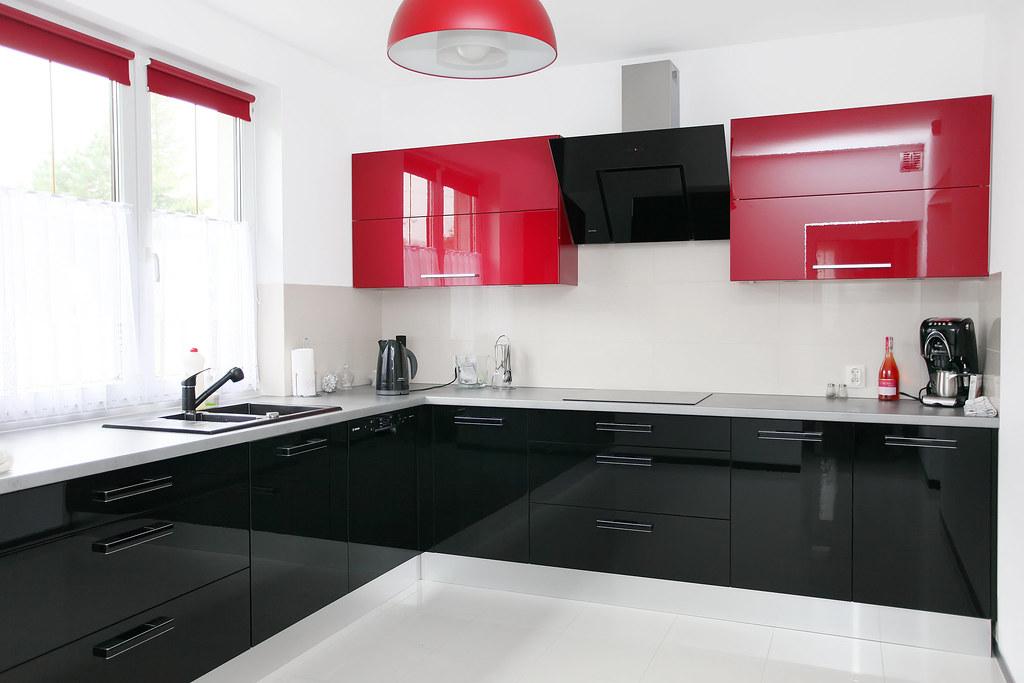 Бо́льшую часть площади фасадов в таких гарнитурах обычно занимает алый цвет. Если выбрать в качестве доминирующего чёрный, есть риск получить излишне мрачный и драматичный интерьер.