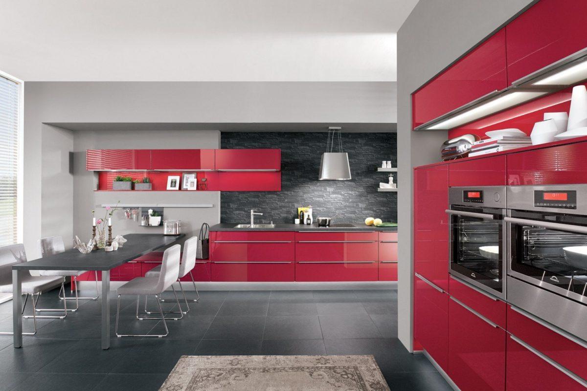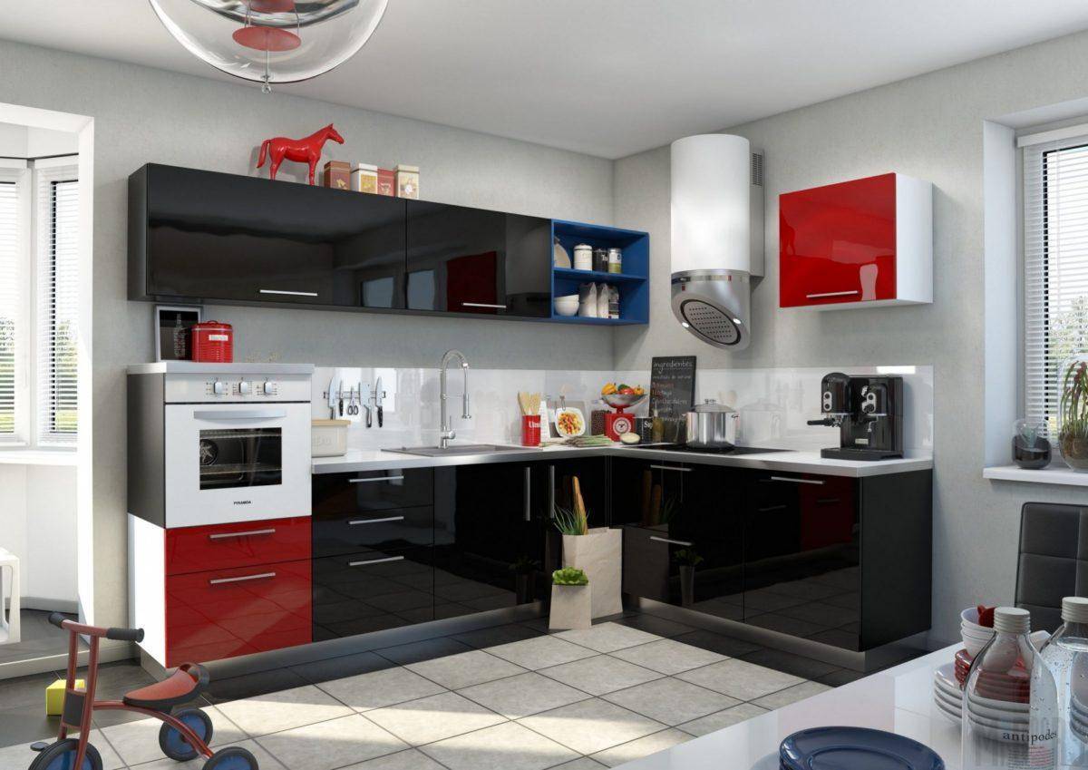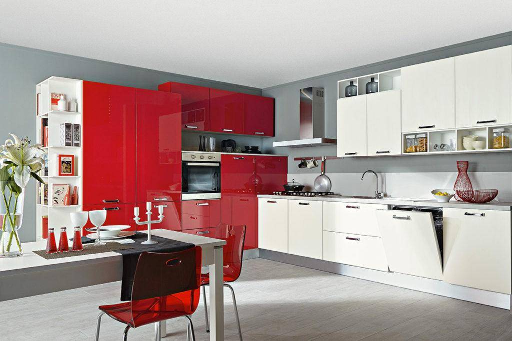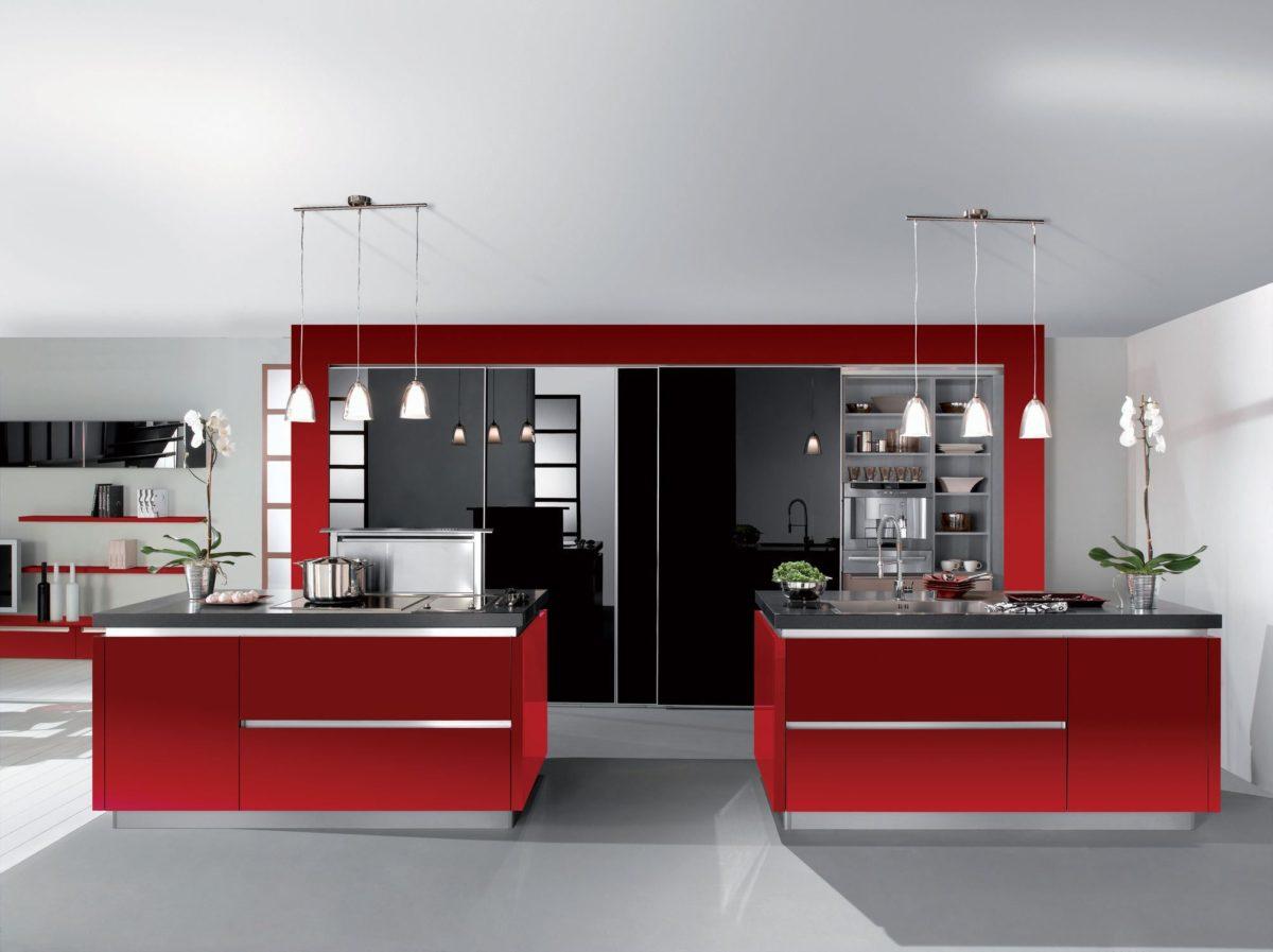 Бо́льшую часть площади фасадов в таких гарнитурах обычно занимает алый цвет. Если выбрать в качестве доминирующего чёрный, есть риск получить излишне мрачный и драматичный интерьер.