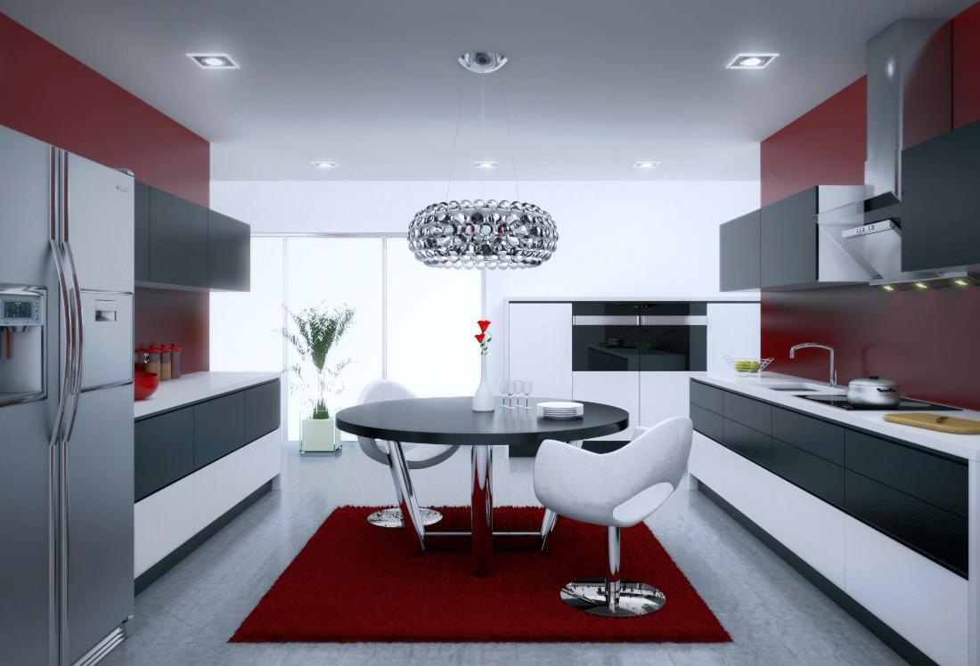Красная люстра — стильный и яркий декоративный элемент, который подчеркнет общий стиль помещения и станет его изюминкой. Подвесная люстра, расположенная над обеденным столом, поможет зонировать кухню, выделив столовую.