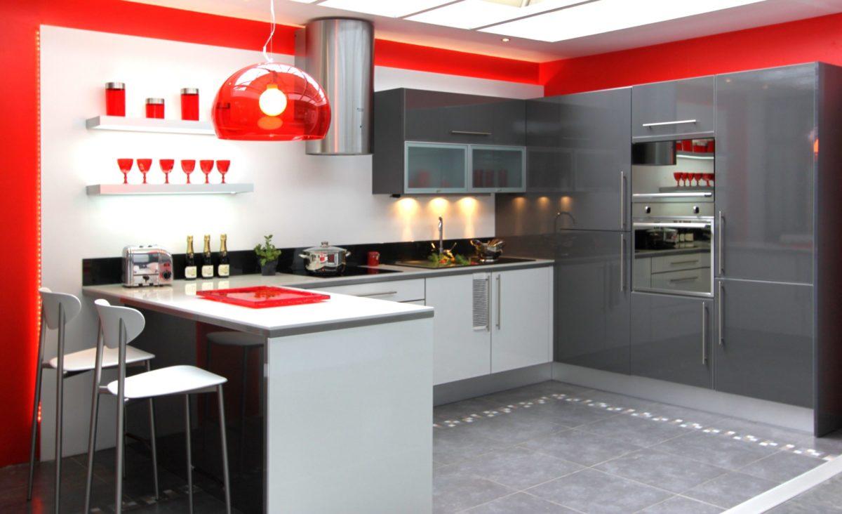Обычно в просторных кухнях находится место для множества бытовой техники. Здесь можно легко разместить холодильник, посудомоечную и стиральную машину. Эти приборы вовсе необязательно должны быть красными. Известно, что красный, будучи основным цветом интерьера, неплохо сочетается со всеми оттенками серого. Поэтому бытовую технику можно выбрать не белую, а серую. Кухонные стены также можно сделать светло-серыми, чтобы интерьер выглядел завершенным.