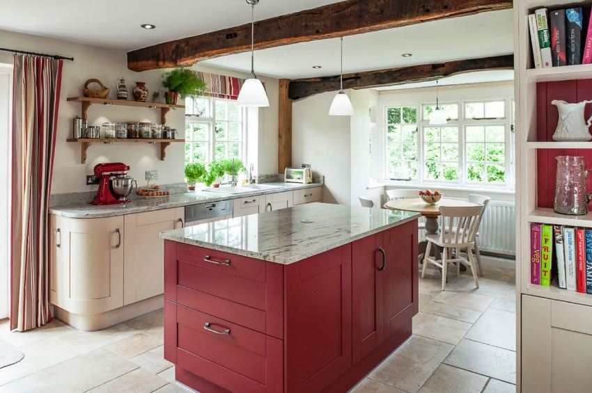 Это хороший вариант для солнечной кухни. При этом используются холодные оттенки красного, иначе летом кухня будет восприниматься особенно жаркой. Если окна выходят на юг, красные оттенки требуют разбавления нейтральными и прохладными тонами.