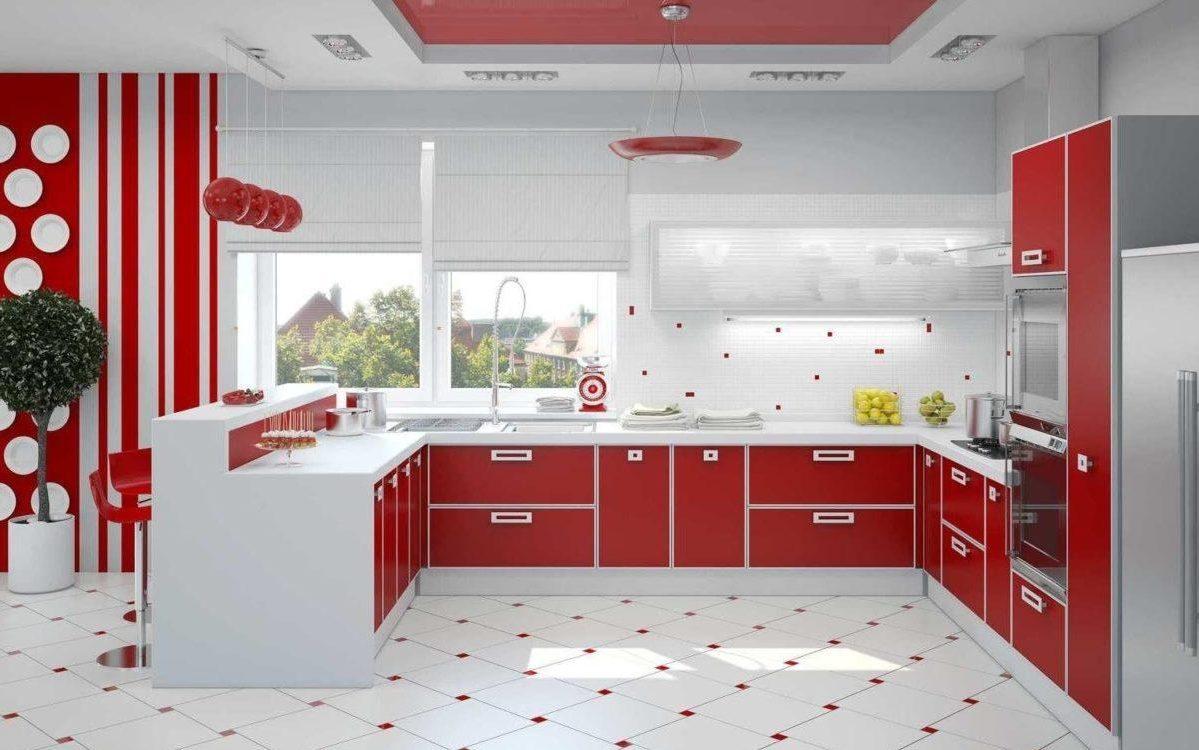 Дизайн кухни в красном цвете предполагает различные варианты отделки, предусматривающие выделение одного из нейтральных светлых оттенков на фоне красного цвета. Так, уместно сделать красный фартук для кухни, выложенный с помощью керамической плитки. Его продолжением может стать напольное покрытие красного оттенка. Среди фото интерьеров кухни в красном цвете часто встречаются варианты, когда пол будет комбинированный. Например, отлично смотрится напольное покрытие, выполненное «шахматкой» с применением красной и белой плитки одинаковых размеров.