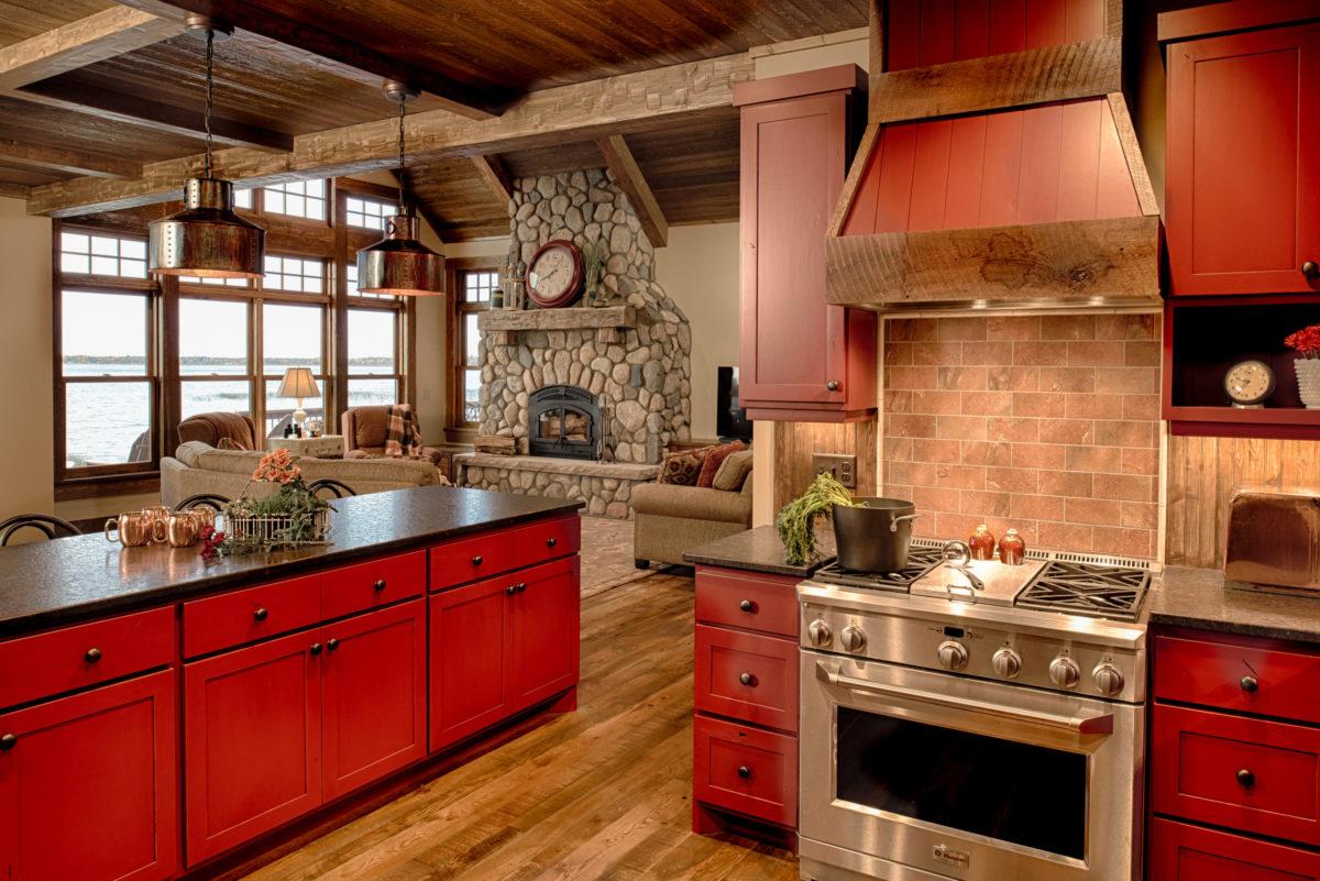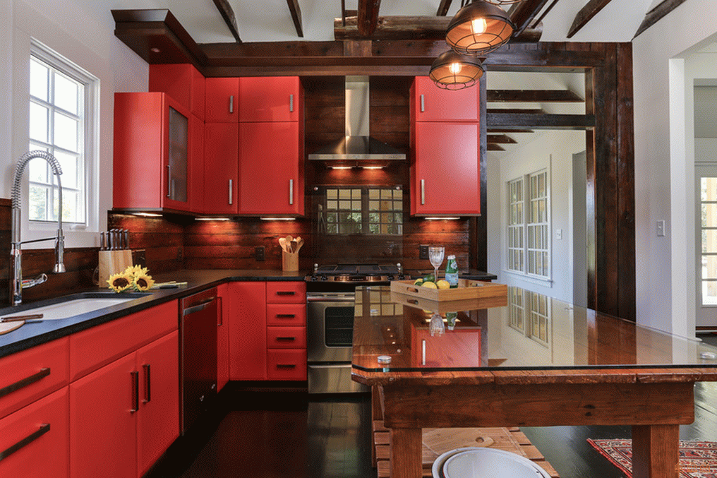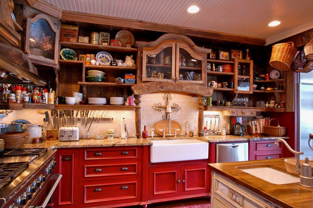 Этот вариант хорошо подойдёт для стиля кантри. Красный гарнитур в этом случае должен иметь матовые фасады и приглушённый цвет (темноватый или бледный). Уместно будет искусственное состаривание. Столешница и фурнитурные элементы выполняются из дерева, а фартук может быть выполнен в коричневой гамме.