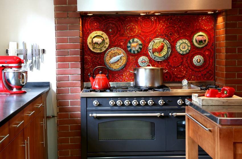 Столешница и фартук — очень важные элементы интерьера кухни, способные придать динамичную изюминку общему дизайну помещения. Для обустройства фартука в красном цвете можно использовать такие материалы, как мозаика, керамическая плитка, однотонное стекло, плитку с рисунком, стекло с печатью на нем.