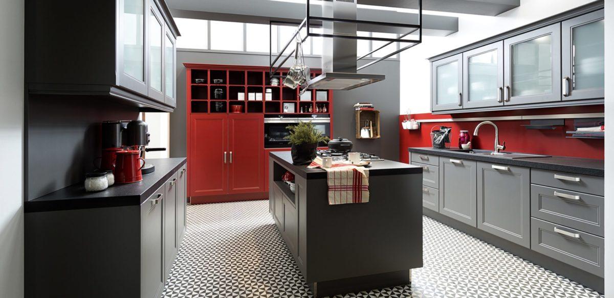 Ещё один вариант – матовая красная кухня, дополняемая чёрной столешницей цвета «соль с перцем». Такой гарнитур хорошо вяжется с отделкой стен и пола в серых тонах.