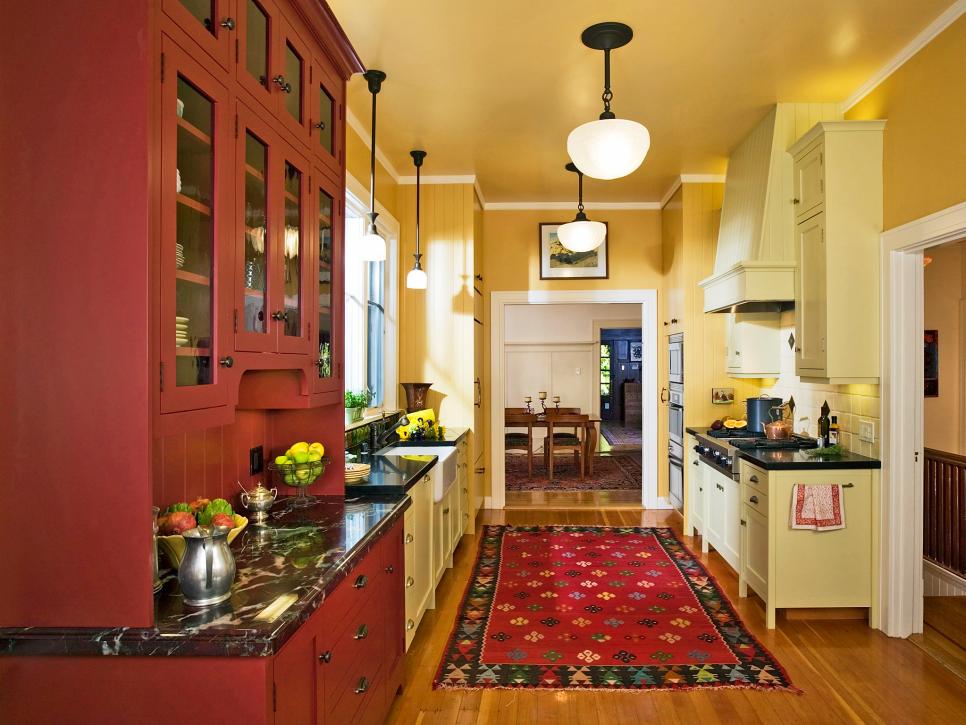Согласно этому же принципу старайтесь выбирать дополнительные и вспомогательные цвета интерьера. Так, например, на кухне, в которой не хватает естественного освещения, в паре с алым прекрасно будут выглядеть желтые, песочные, бежевые оттенки.