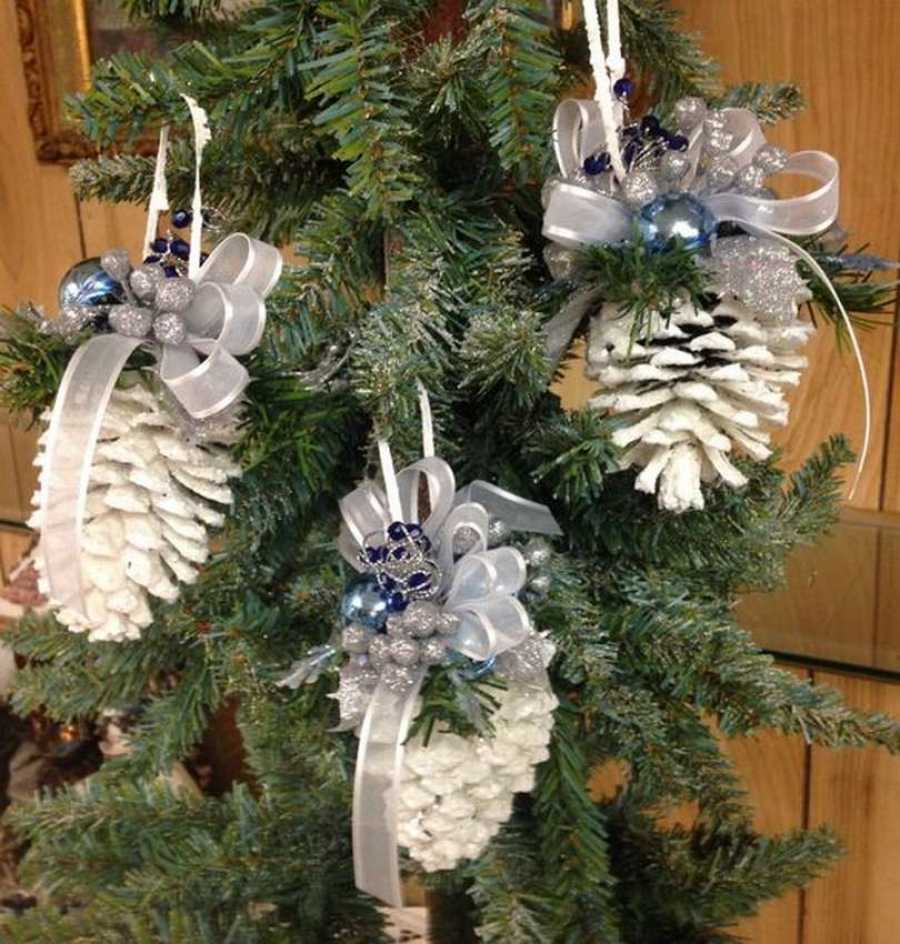 - Новогодний декор: небольшие шарики, шишки, ленты. Их можно купить в супермаркетах или «Фикс-прайсе» по цене до 100 Р за набор.